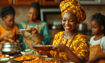 Happy nigerian family wearing native atire having dinner in a kitchen dining room, the mother is dishing from s serving dish.