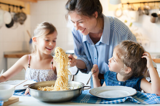 Happy mother and children eating pasta together at home kitchen, enjoying family lunch, healthy comfort food for kids. Homemade Italian cuisine. Candid, authentic lifestyle of solo motherhood