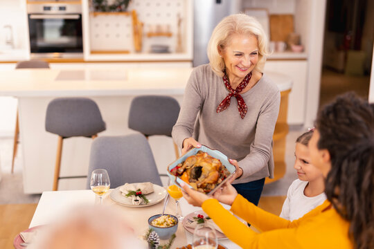 Grandfather serving festive meal at family christmas celebration