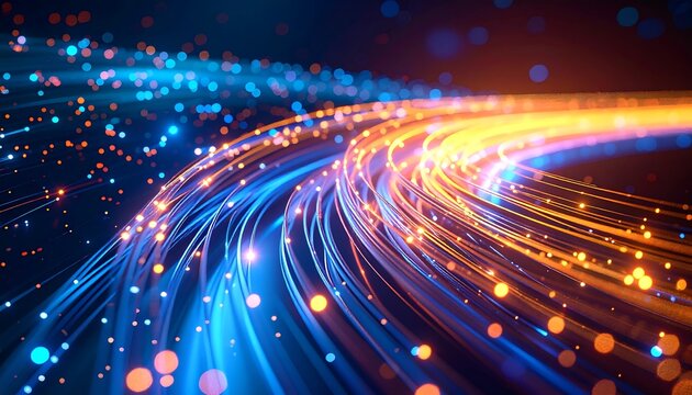 Abstract digital illustration with flowing lines of blue and orange light, creating a sense of speed and connectivity.