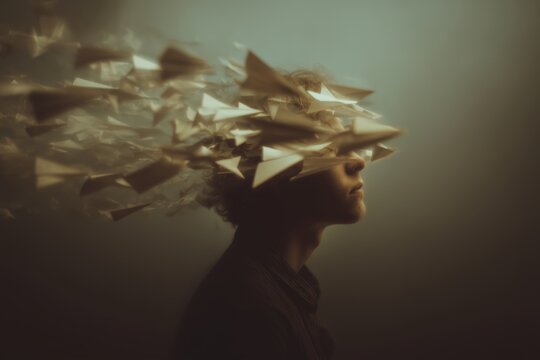 Creative representation of thought and imagination with paper airplanes flying from head in a surreal atmospheric setting