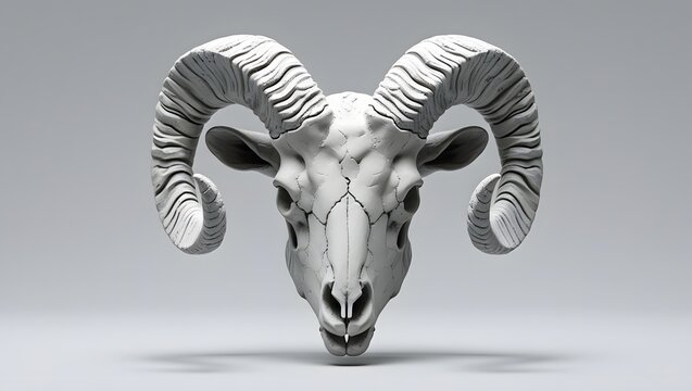 Ram skull with horns, clay-like sculptural style, isolated on pure white background