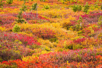 Mount Rainier National Park at the tourist destination of Paradise with a carpet of colors as the vegetation turns an array of golden colors