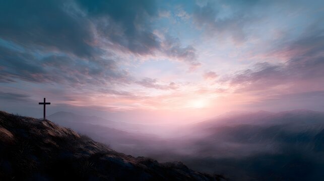 Cross on a mountaintop at sunrise symbolic of spiritual awakening