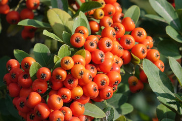 Close Up of Ripe Orange Rowan Berries With Green Leaves