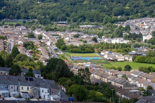 Aerial view of a residential neighborhood in Mountain Ash, South Wales