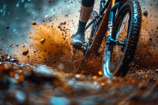 Dramatic close-up of a mountain bike and the lower body of a biker navigating a muddy path