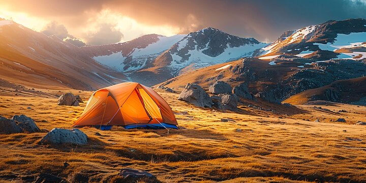 Wonderful panoramic view of a campsite in the wilderness in the mountains on lush green meadow. blue sky and copy space for text