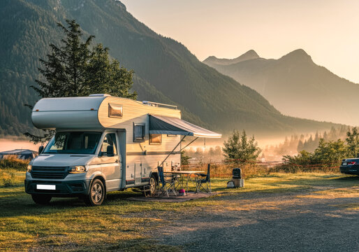 Scenic mountain campground with rv at sunrise - ideal for outdoor adventures and travel retreats