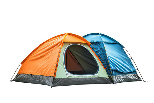 Two colorful camping tents in an outdoor setting, showing vibrant orange and blue colors, ideal for camping enthusiasts and outdoor adventures.
