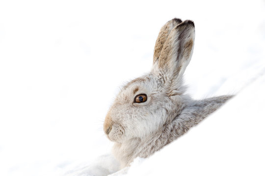 The mountain hare, Lepus timidus, in winter pelage, hiding in the snowy winter landscape in Setesdal, Norway