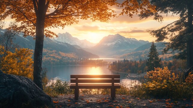 Bench overlooking a tranquil lake with fall foliage and mountain backdrop at sunrise.