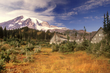 Clouds over snowcapped mountain, Paradise Lodge, Mount Rainier National Park, Washington State, USA