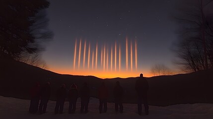 Twilight meadow glowing with magenta light pillars, silhouetted trees and starlit sky