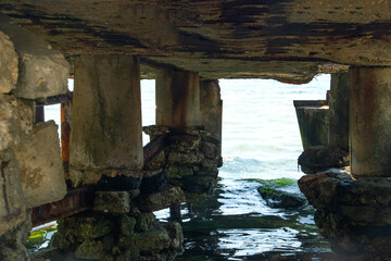 View from underneath a decaying concrete structure reveals the sea, with weathered pillars and algae-covered rocks submerged in the clear, green-tinted water