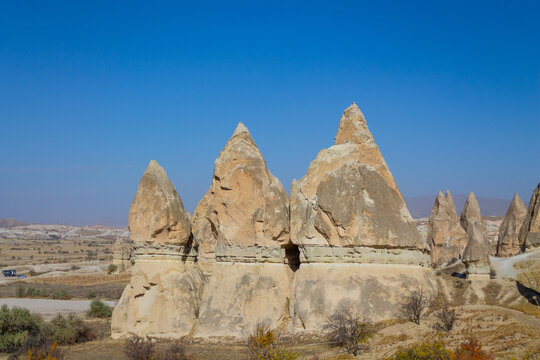 Cappadocia valley in Turkey. Cappadocia rock formation sites and chimneys Love Valley. Tuff volcanic rock pillars and mushrooms in the museum under open sky in Cappadocia turkish famous tourist sight