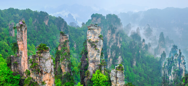 Majestic Zhangjiajie national forest park: towering sandstone pillars emerging from lush green forest, Wulingyuan Scenic Area, Hunan Province, China.