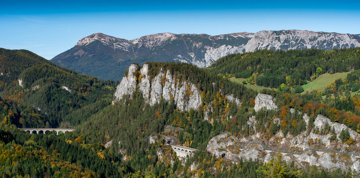 Viaduct and tunnel on the Semmering Railway with the Rax mountain range in the background. The Semmering Railway is the oldest mountain railway of Europe and a Unesco World Heritage site.