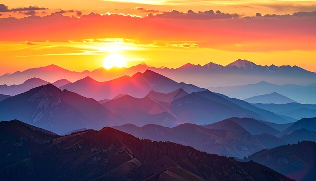 A vibrant sunrise emerges, casting light over layered mountain ranges against a gradient sky