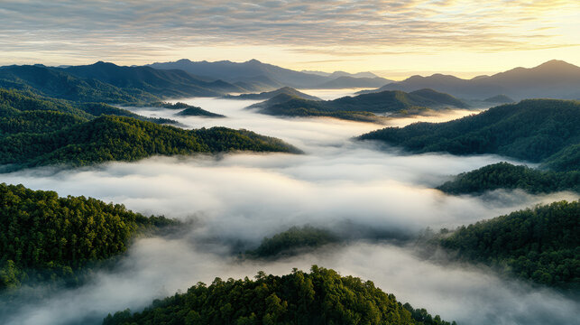 Misty mountain landscape with dense forest at sunrise