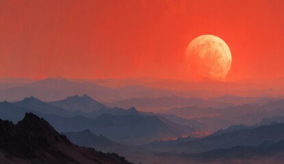 Red sunset over alien mountains