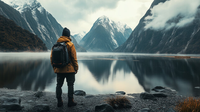Solitude's Embrace: A solitary figure sits in serene contemplation amidst a dramatic landscape. The mountains and sky become the backdrop, inviting the viewer to pause and reflect.