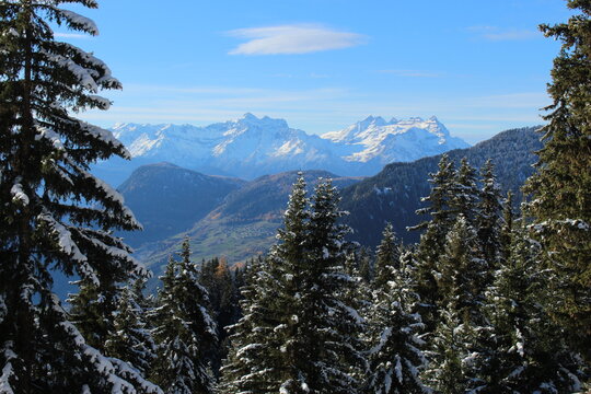snow covered mountains and evergreen covered valleys  in late autumn (Verbier, Switzerland). Swiss alpine winter wallpaper or background or screensaver