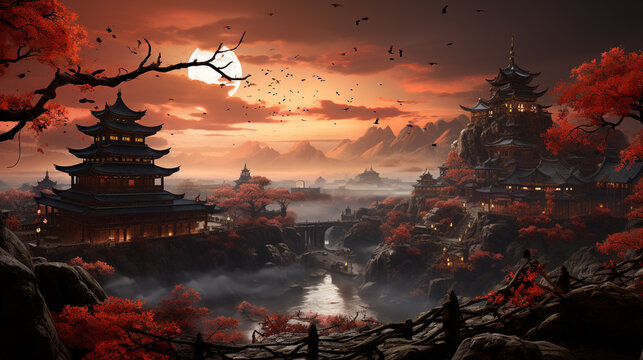 Scenic mountain lake landscape at sunset with cabins and autumn foliage