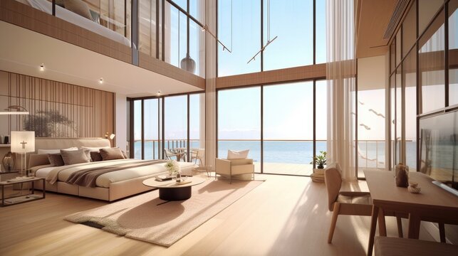 beautiful city resort interior and patio terrace design living area open space balcony design with nature lake water and palm tree background,ai generate