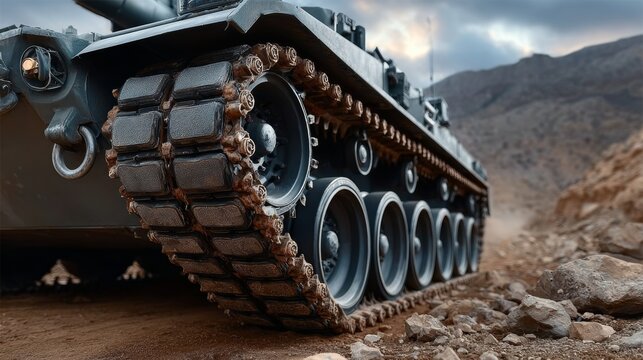 Military tank with detailed tracks navigating rocky terrain, showcasing robust engineering and powerful design, set against a dramatic mountainous backdrop in an outdoor environment