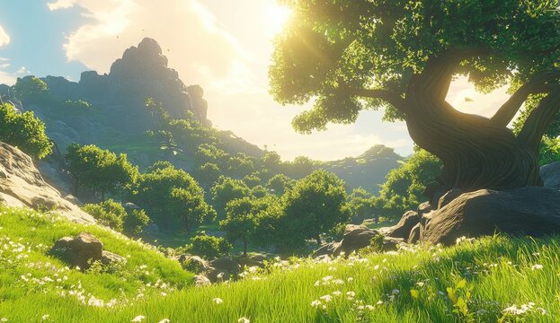 2D cartoon-style depiction of a mountainous terrain with lush meadows and vibrant greenery under a clear sky