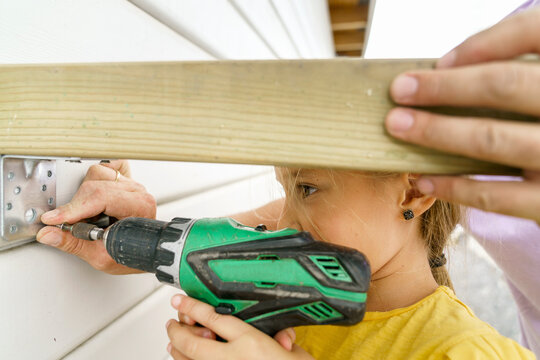 TV wall mount bracket, electric drill, fountain pen, tape measure, hammer and monitor on a white background. The concept of mounting a TV or computer monitor on a wall