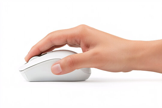 Close up photo of hand using modern wireless computer mouse. Person clicks mouse. Isolated on white background. Tech device. Input device. Ergonomic design. Simple modern tech. Easy to use. User