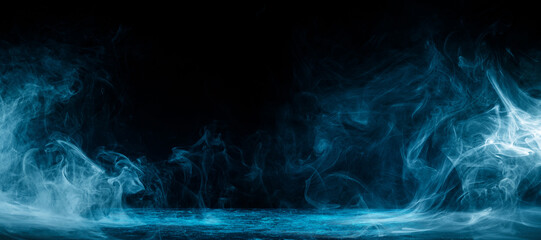 Abstract image of dark room concrete floor. Black room or stage background for product placement.Panoramic view of the abstract fog. White cloudiness, mist or smog moves on black background.