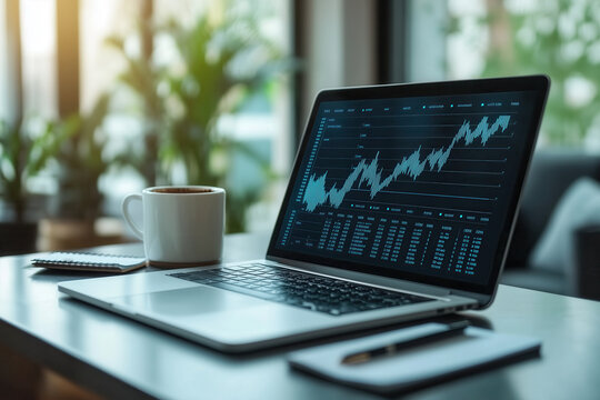 laptop with graphs or charts moving upward on office desk with cup of coffee