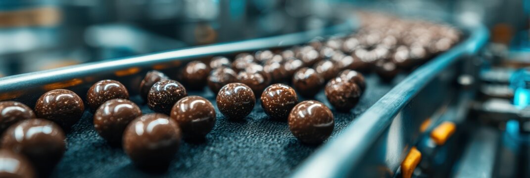 Chocolate treats moving along a conveyor belt in a factory during the day