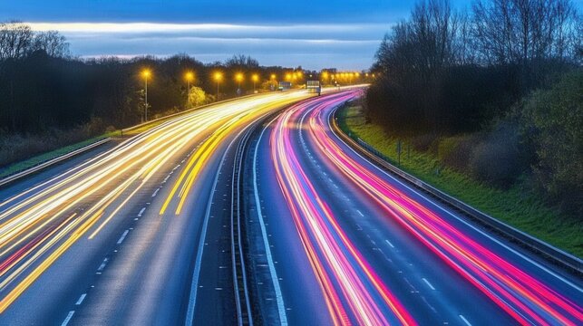 Empty highway at dusk with speeding light trails from cars