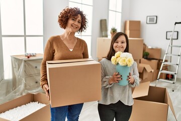 Mature mother and down syndrome daughter moving to a new home, standing by cardboard boxes