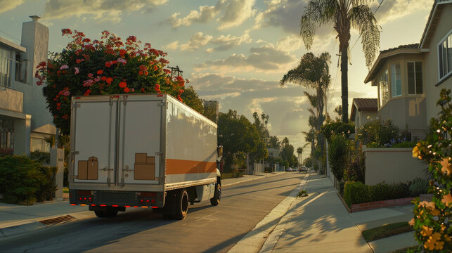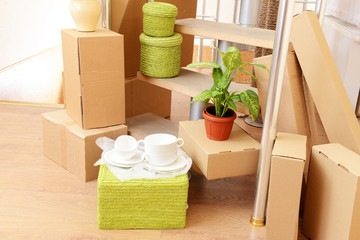moving, things in boxes, garage sale, flower in a pot on a white background Copy space