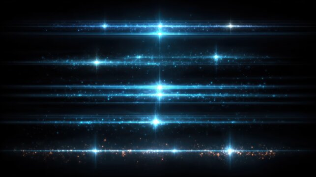 Blue horizontal lens flares pack with laser beams and glowing light rays, isolated on white background, beautiful streaks and shine effects, perfect PNG collection for overlays and futuristic designs