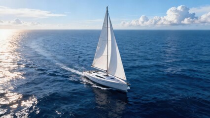 White sailing yacht moves swiftly across the deep blue ocean water leaving a noticeable foamy wake trail.