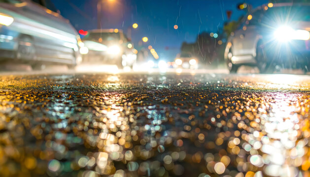 Reflections on a rainy city street with blurred car lights illuminating the wet asphalt at night