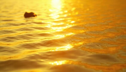 Golden water surface reflects bright sun light. Gentle waves move on liquid. Orange yellow ocean surface ripples. Abstract nature background with sun glare.