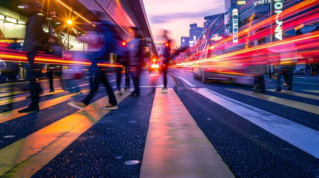 Long exposure shot of crowd of business people walking in bright office fast moving with blurry