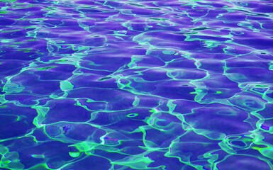 Surreal pop art of ultramarine blue and lime green colored water surface in the sunlight