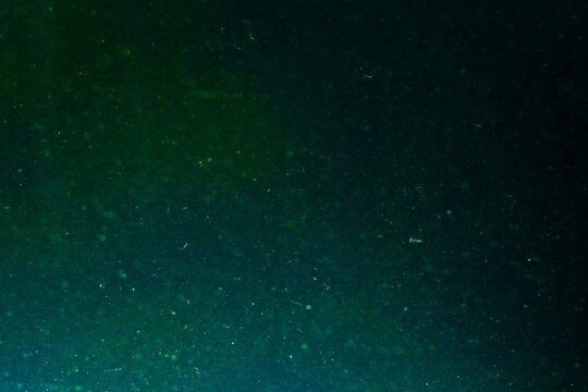 Abstract water background with dark green glow Chaotically moving glowing dust particles in water. Underwater. Macro world. Textured. Wallpaper