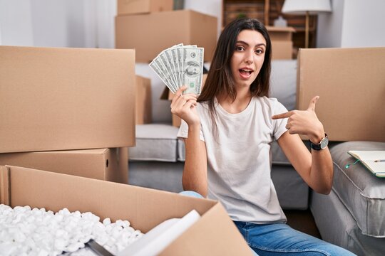 Young beautiful woman sitting on the floor at new home holding money pointing finger to one self smiling happy and proud