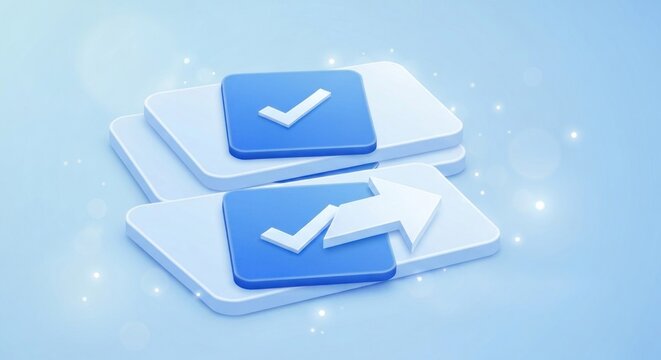 Blue checkmark, arrow, and blocks float in ethereal light against soft blue