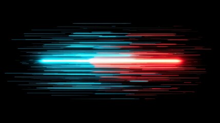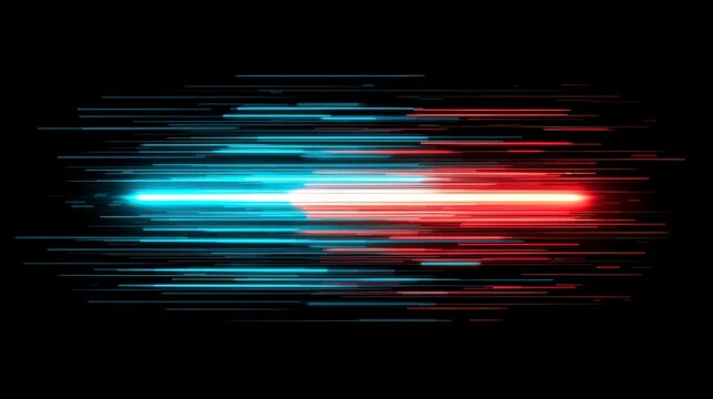Abstract image featuring dynamic red and blue light trails converging centrally on a dark backdrop. Swirling lines create a symmetrical, vibrant, and energetic visual effect.