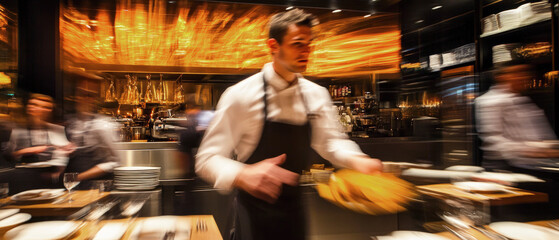 A busy waiter moves swiftly through an upscale restaurant with a blurred background, capturing the energy and fast-paced environment of fine dining. Banner, motion blur.